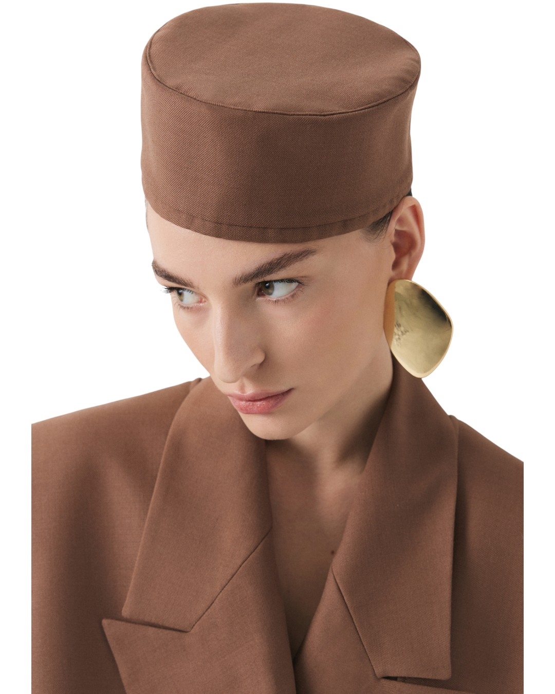 Головной убор, выполненный в дополнение к жакету оверсайз кроя, идеально завершает образ.