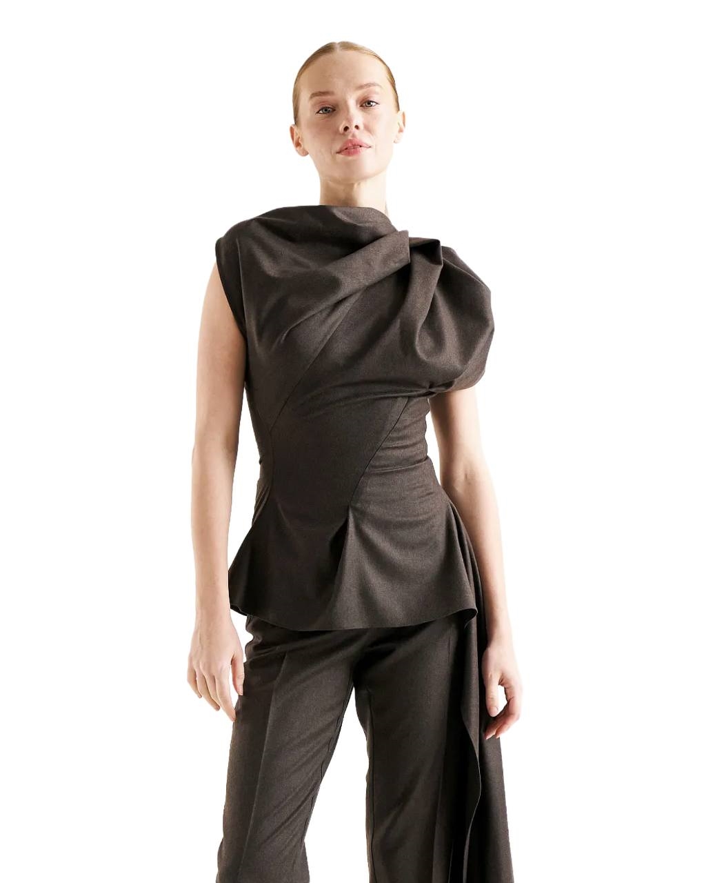 Приталенный топ из мягкой шерсти сочетает в себе скульптурный дизайн и тактильную роскошь. Его авангардный силуэт подчеркнут сложным кроем по косой и изящной драпировкой на груди, создающей поразительный визуальный эффект. Женственность и динамику модели довершает цельнокроеная баска, которая плавно переходит в удлиненный боковой шлейф, добавляя образу легкость и движение. Идеальный выбор для тех, кто ценит смелые, но утонченные решения, этот топ предлагает дерзкую эстетику, уют и комфорт благодаря природной мягкости шерсти. Станет ключевым элементом как для многослойных комплектов, так и для самостоятельного яркого лука.