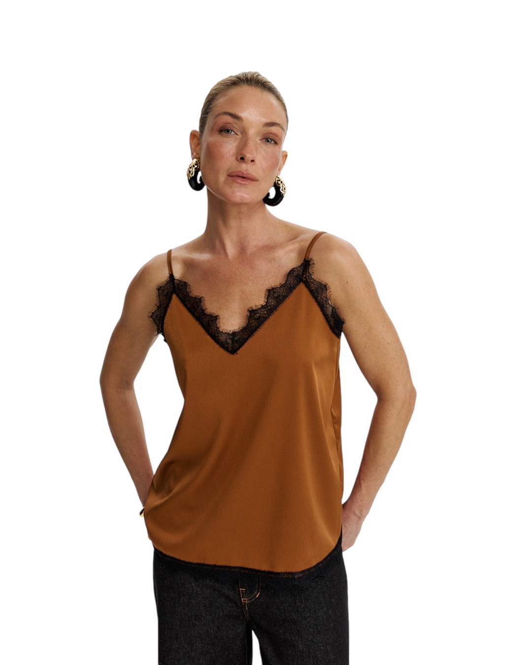 Топ на тонких бретелях в бельевом стиле порадует своей романтичностью и элегантностью. Отделка из кружева позволяет использовать модель в различных образах. Кружевной топ свободного силуэта подходит на любую женскую фигуру. Он универсален и отличается высоким комфортом.