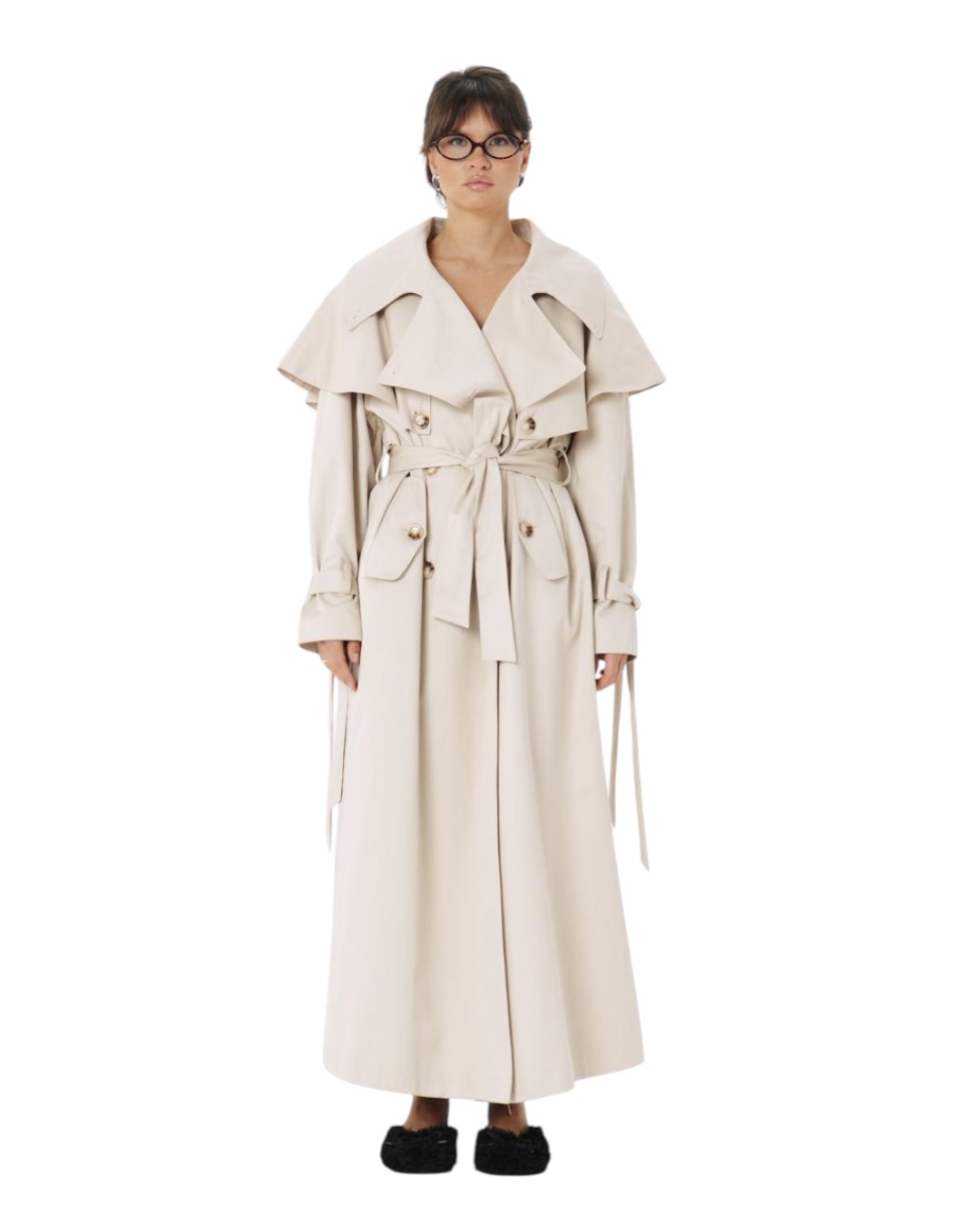 Тренч длины макси с отстёгивающейся пелериной.