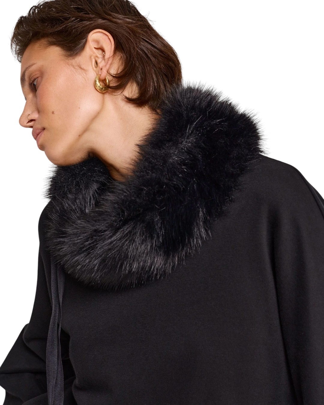 Воротник из мягкого экомеха в глубоком чёрном цвете – самый подвижный аксессуар. Его можно носить как классический ворот, усиливая выразительность верхней одежды, завязать как пояс на пальто или добавить в вечерний образ акцентом на талии. И это только начало – мы уверены, что у вас найдётся ещё десятки способов обыграть его. Универсальная деталь, которая играет с пропорциями и меняет настроение всего силуэта.