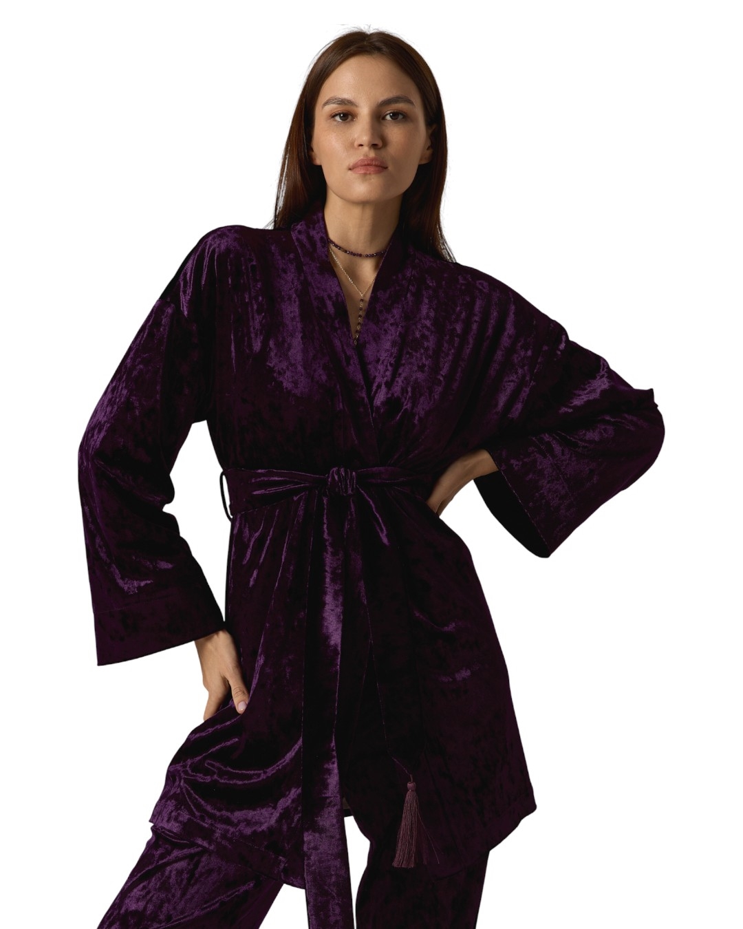 Бархатный жакет создаёт атмосферу настоящей роскоши. Тактильно приятный подклад и кисти ручной работы в тон бархату. Расслабленный жакет завязывается на широкий пояс с кисточками. Внутри есть дополнительная лента для фиксации полочки. Сочетание оттенков и мраморной красивой фактуры бархата создаёт богемное настроение, где бы вы не находились.