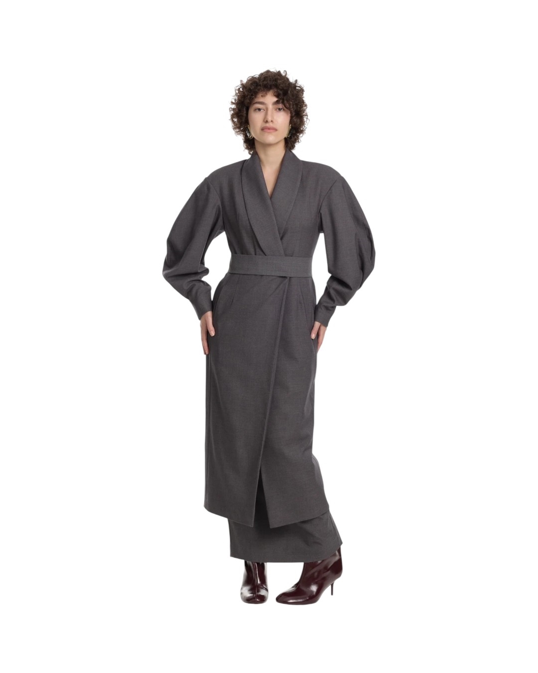 Жакет в минималистичном сером оттенке — воплощение современного баланса между силой и элегантностью. Удлиненный силуэт с глубоким запахом и поясом подчеркивает талию, создавая изящный акцент.