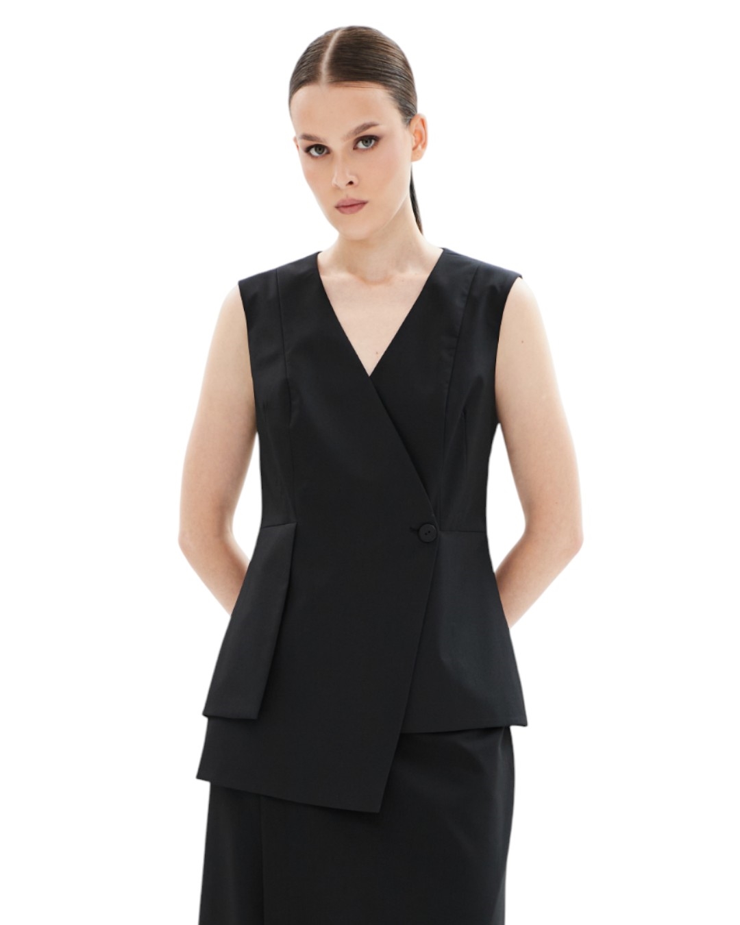 Двубортный жилет из костюмной поливискозы приталенного силуэта. Низ жилета ассиметричен, а сбоку есть декоративный притачной элемент.